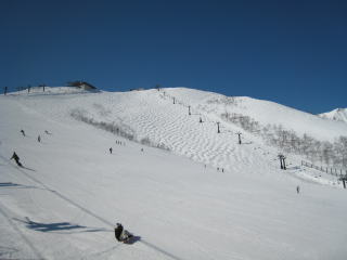 朝一リーゼン・・八方尾根によく行く人にとってはまずこれ。朝まだ誰にも荒らされていない締まったリーゼンコースをかっとぶ、こんな気持ちのいいものはありません。なんだけどねぇ。昔と違って今は、朝早く起きるの苦手になったし、そもそもノンストップでリーゼン滑りきる体力なくなったし。悲しいな。でも今はほんとにいい時代だよね。かつてのスキーブームの頃、まず渋滞などでスキー場までたどり着くのが大変、リフト待ちながーいの当たり前、コースは人だらけ、昼食も椅子さがしが延々と。それでも楽しかったけどね。今は幸せだよね。リーゼンクワットも10時過ぎたらほとんど並んでないし。十分滑れるスペースもあるし。まぁあの頃が異常だったんじゃないかなぁ。おじーの大好きなコースを。名木山トリプル⇒リーゼンクワット⇒アルペンクワッド⇒グラードクワッドで一応てっぺんに行ってここからまず一発、リーゼングラート⇒兎平左(こぶのない下から見て一番左寄り)⇒パノラマコース⇒パノラマ途中から右に行ってセントラルコース⇒白樺上部⇒名木山壁の下を横切る⇒名木山南。なかなか長いコースですよ。で、次にまたまた同じリフトの乗継でてっぺんに。2本目はリーゼングラード⇒黒菱⇒スカイライン整地⇒北尾根⇒オリンピックコース下部⇒国際を横切って白樺ゲレンデ⇒ゴンドラへ。これもなかなかながーいコースで好きです。お昼はもっぱらイエティー内の味噌ラーメンかな。唐辛子いっぱいかけて。ここで不満を一言。すいていて営業収入確保に走りたいのはわかるけど、せっかく広いからってわざわざ八方まで来てるのに、しょっちゅうコースセパレートってどうなの?とぎれとぎれのコースとか狭くなったコースじゃ八方の魅力なくなっちゃうよ。特にオリンピック女子コースの閉鎖多すぎ!確かに急だし、ほかにコースあるでしょ?はわかるけど。まぁスキー場がなくなっちゃったら困るから仕方ないのかねぇ。